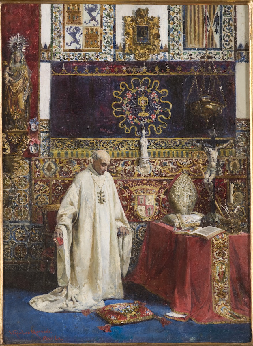 En la escena vemos el interior de una iglesia, tal vez una sacristía, en la que un abad (lo sabemos por la mitra que hay sobre la mesa) podría estar inmerso en una lectura o a punto de comenzar la propia misa.