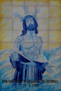 Inicio Obras 00511. Retablo cerámico. Jesús Despojado de sus Vestiduras. Granada. 00511. Retablo cerámico. Jesús Despojado de sus Vestiduras. Granada. Código00511Tipo de obraRetablo cerámicoFunciónDevocionalTipo de panelPictóricoAutorReina González, RafaelFuente de autoríaFirmadoCronología2012Fuente de la cronologíaDatado en la obraDimensiones1,00 m. x 1,50 m. (aprox.)Pieza datadaSi Lugar exacto donde se encuentraFachada del Convento de San Antón. Calle San AntónPoblaciónGranadaProvinciaGranadaPaísEspañaSituada en elExteriorLugar de producciónGranadaZona de producciónAndalucíaTécnica decorativaAzulejo plano pintadoTema de decoración o temáticaReligiosa - pasionistaEscenaJesús despojado de sus vestidurasPersonajes representadosJesús de NazaretAdvocacionesDespojado Autor de las fotografíasAntonio Entrena Aznarte. Octubre 2014
