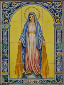 Inicio Obras 01268. Retablo cerámico. Virgen Milagrosa. Hospital de la Cruz Roja. Sevilla. (Desaparecido) 01268. Retablo cerámico. Virgen Milagrosa. Hospital de la Cruz Roja. Sevilla. (Desaparecido) Código01268Tipo de obraRetablo cerámicoFunciónDevocionalTipo de panelPictóricoAutorChaves Tejada, AlfonsoTallerRamos Rejano, FábricaFuente de autoríaFirmadoCronologíaDécada de 1950Fuente de la cronologíaEstimaciónDimensiones0,60 m. x 0,80 m. (aprox.)Pieza datadaNo Lugar exacto donde se encuentraDependencias del Hospital de la Cruz Roja. Avenida de la Cruz Roja, 1. (Desaparecido)PoblaciónSevillaProvinciaSevillaPaísEspañaSituada en elInteriorLugar de producciónSevillaZona de producciónAndalucíaTécnica decorativaAzulejo plano pintadoTema de decoración o temáticaReligiosa - letíficaPersonajes representadosVirgen MaríaAdvocacionesMilagrosa Más datosEsta obra fue retirada de su ubicación en el interior del hospital a finales de 2010, sin que sepamos si se conservó o se destruyó. ConjuntoPatrimonio oculto o perdidoSevilla. Hospital de la Cruz Roja "Victoria Eugenia". Autor de las fotografíasJosé Chaves Romero de la Osa. Septiembre 2010