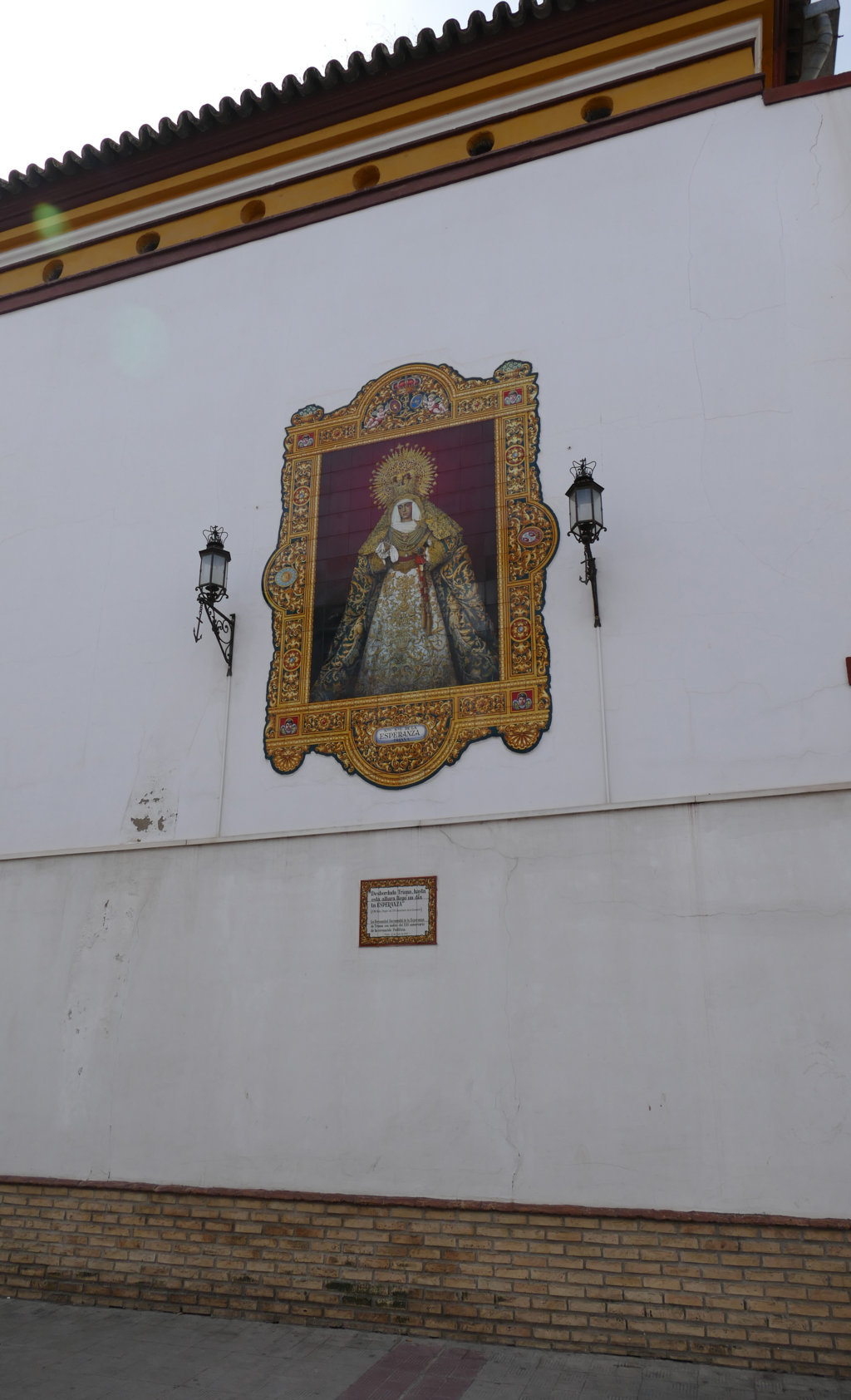 La premura por la bendición del nuevo retablo cerámico de Nuestra Señora de la Esperanza, tras días de intensa lluvia en Sevilla así como la sincronización con la apretada agenda de Monseñor Asenjo, ha impedido su acabado total, apreciable por las piezas del borde que deberán ir recortadas, como así se hará de inmediato. Las medidas totales de la obra son de 3.60 metros de alto por 2.40 metros de ancho, en azulejos de 20 x 20 cm. La ejecución de la imagen de la Dolorosa está realizada a tamaño real, utilizando el ceramista como modelo más de una veintena de fotografías para reflejar perfectamente todos los detalles de esta venerada imagen, cuya ejecución le ha llevado más de cinco meses de trabajo, así como la cenefa decorativa, en la cual se han empleado casi dos meses.