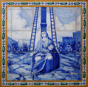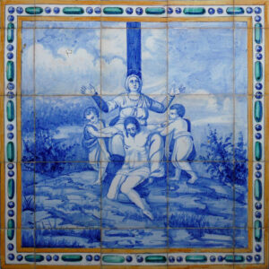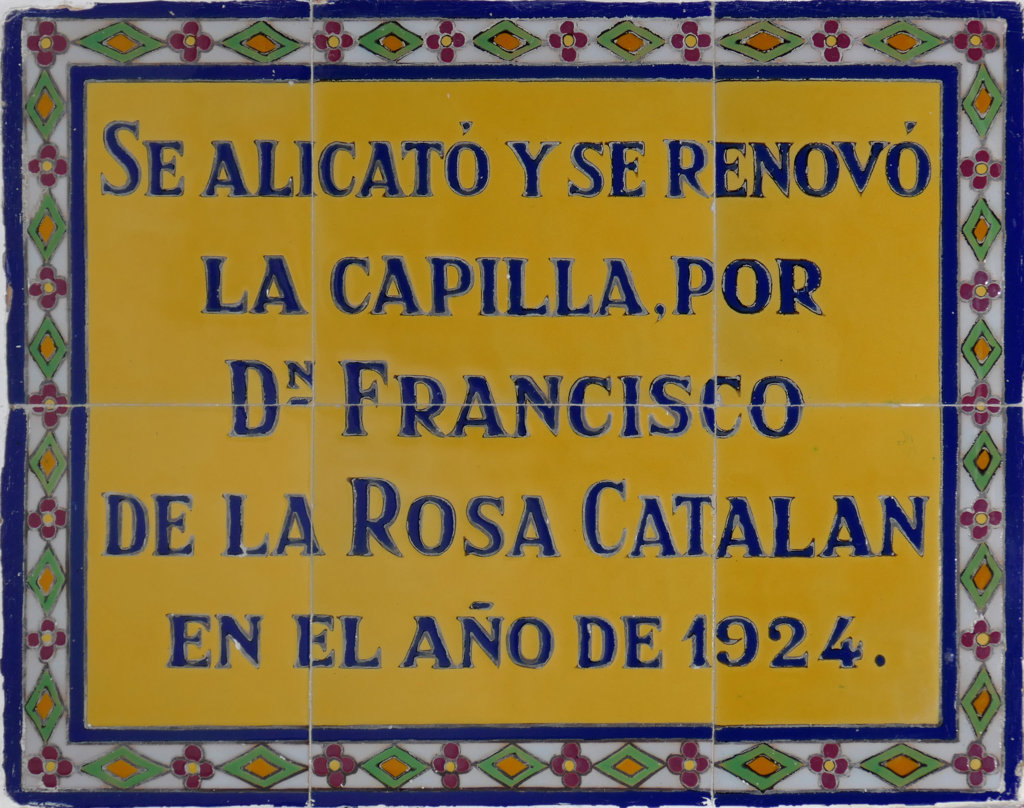 La placa cerámica que se ubica sobre el zócalo contiene la siguiente inscripción: Se alicató y se renovó la capilla, por D. Francisco de la Rosa Catalán en el año de 1924.