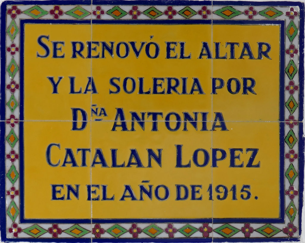 En otra placa se dice también: Se renovó el altar y la solería por Dª. Antonia Catalán López en el año de 1915.