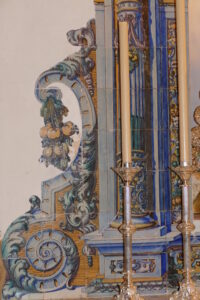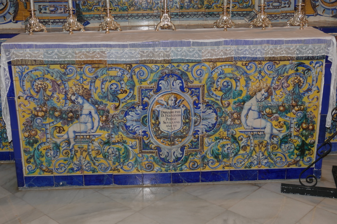 Inicio Obras 04232. Altar. Iglesia de San Pedro. Huelva. 04232. Altar. Iglesia de San Pedro. Huelva. Código04232Tipo de obraAltarFrontal de altarFunciónReligiosa, ritualTipo de panelPictóricoAutorDesconocidoTallerManuel Rodríguez Pérez de Tudela. FábricaFuente de autoríaFirmadoCronología1921Fuente de la cronologíaDatado en la obraPieza datadaSi Lugar exacto donde se encuentraInterior de la Parroquia Mayor de San Pedro. Plaza de San PedroPoblaciónHuelvaProvinciaHuelvaPaísEspañaSituada en elInteriorLugar de producciónSevillaZona de producciónAndalucíaTécnica decorativaAzulejo plano pintadoTema de decoración o temáticaMotivos renacentistasVegetal Autor de las fotografíasAlfonso García García. Octubre 2013. Manuel Pablo Rodríguez Rodríguez. Septiembre 2025