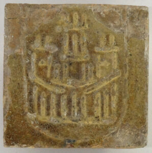 Azulejo en relieve que representa un castillo. La pieza está cubierta por un vidriado en color miel.