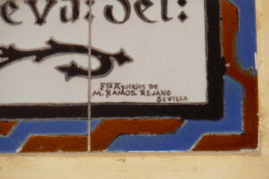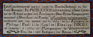 Inicio Obras 05930. Panel epigráfico. Palacio de las Dueñas. Sevilla. 05930. Panel epigráfico. Palacio de las Dueñas. Sevilla. Código05930Tipo de obraPanel de azulejosFunciónConmemorativaTipo de panelPictóricoAutorDesconocidoTallerRamos Rejano, FábricaFuente de autoríaFirmadoCronologíaDécada de 1910Fuente de la cronologíaEstimaciónDimensiones1,50 m. x 0,60 m. (aprox.)Pieza datadaNo Lugar exacto donde se encuentraApeadero del Palacio de las Dueñas. Calle Dueñas, 5PoblaciónSevillaProvinciaSevillaPaísEspañaSituada en elInteriorLugar de producciónSevillaZona de producciónAndalucíaTécnica decorativaCuerda secaTema de decoración o temáticaEpigráfica ConjuntoSevilla. Palacio de las Dueñas Autor de las fotografíasManuel Pablo Rodríguez Rodríguez. Septiembre 2025