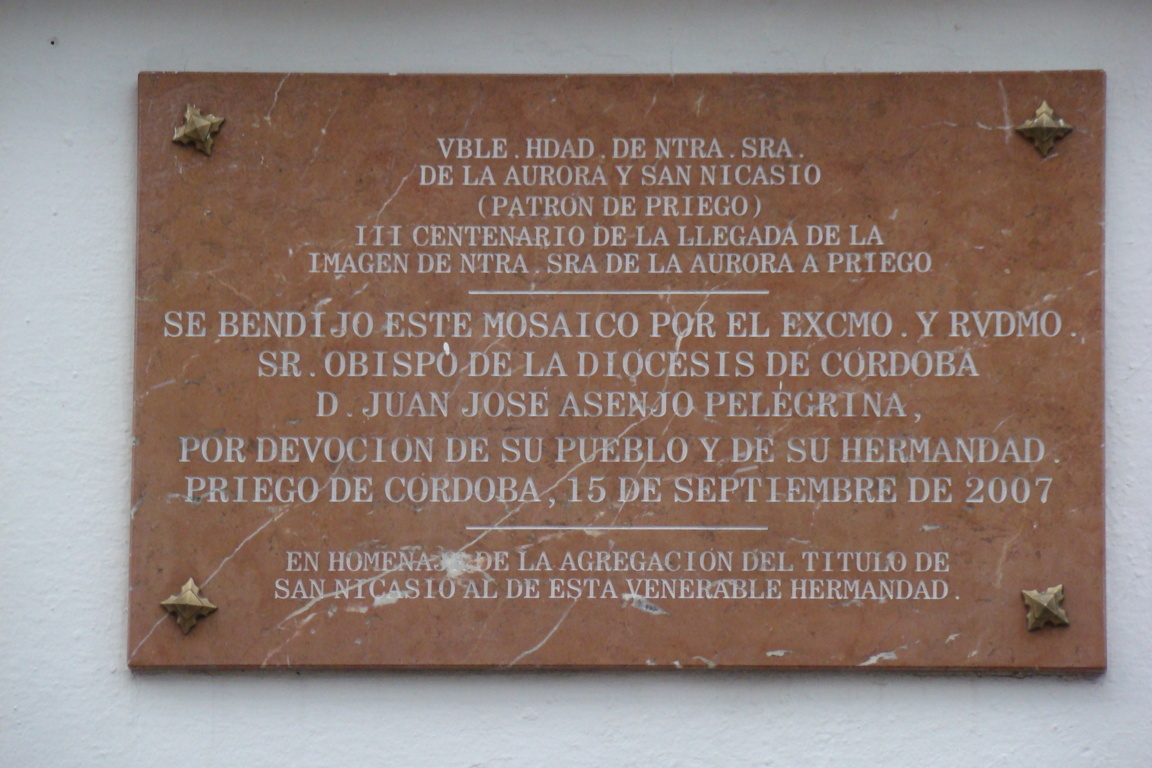 Inicio Obras 06527. Retablo cerámico. San Nicasio. Iglesia de San Juan de Dios. Priego de Córdoba. Córdoba. 06527. Retablo cerámico. San Nicasio. Iglesia de San Juan de Dios. Priego de Córdoba. Córdoba. Código06527Tipo de obraRetablo cerámicoFunciónDevocionalTipo de panelPictóricoAutorPalenciano Ruiz, PedroFuente de autoríaFirmadoCronología2007Fuente de la cronologíaDatado en la obraDimensiones1,80 m. x 3,00 m. (aprox.)Pieza datadaSi Lugar exacto donde se encuentraFachada trasera de la Iglesia de San Juan de Dios. Calle CavaPoblaciónPriego de CórdobaProvinciaCórdobaPaísEspañaSituada en elExteriorLugar de producciónAndújarZona de producciónAndalucíaTécnica decorativaAzulejo plano pintadoTema de decoración o temáticaReligiosa - hagiográficaPersonajes representadosNicasio Obispo, San Autor de las fotografíasManuel Pablo Rodríguez Rodríguez. Septiembre 2020