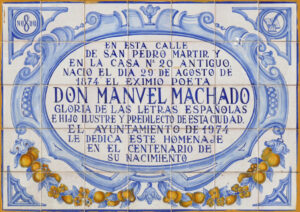Inicio Obras 06741. Panel conmemorativo. Manuel Machado. Calle San Pedro Mártir. Sevilla. 06741. Panel conmemorativo. Manuel Machado. Calle San Pedro Mártir. Sevilla. Código06741Tipo de obraPanel de azulejosFunciónConmemorativaTipo de panelPictóricoAutorDesconocidoCronología1974Fuente de la cronologíaDatado en la obraDimensiones1,05 m. x 0,75 m. (aprox.)Pieza datadaSi Lugar exacto donde se encuentraFachada de domicilio particular. Calle San Pedro Mártir esquina con calle BailénPoblaciónSevillaProvinciaSevillaPaísEspañaSituada en elExteriorLugar de producciónSevillaZona de producciónAndalucíaTécnica decorativaAzulejo plano pintadoTema de decoración o temáticaEpigráfica Autor de las fotografíasManuel Pablo Rodríguez Rodríguez. Septiembre 2025