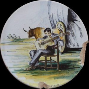 Inicio Obras 08448. Plato con guitarrista. San Juan del Puerto. Huelva. 08448. Plato con guitarrista. San Juan del Puerto. Huelva. Código08448Tipo de obraLoza estanníferaPlatoFunciónOrnamentalAutorDesconocidoTallerCerámica Santa Ana. FábricaFuente de autoríaFirmadoCronología1950. ca.Fuente de la cronologíaEstimaciónPieza datadaNo Lugar exacto donde se encuentraPropiedad particularPoblaciónSan Juan del PuertoProvinciaHuelvaPaísEspañaSituada en elInteriorLugar de producciónSevillaZona de producciónAndalucíaTécnica decorativaLoza pintadaTema de decoración o temáticaCostumbristaRocieraEstado de conservaciónDeficiente. Con roturas Autor de las fotografíasManuel Pablo Rodríguez Rodríguez. Octubre 2020