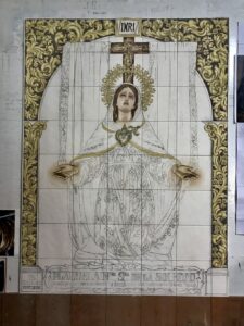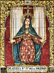 Inicio Obras 08472. Retablo cerámico. Virgen de la Soledad. Almogía. Málaga. 08472. Retablo cerámico. Virgen de la Soledad. Almogía. Málaga. Código08472Tipo de obraRetablo cerámicoRótulo de calleFunciónConmemorativaDevocionalInformación urbanaTipo de panelPictóricoAutorRomero Boldt, PabloFuente de autoríaFirmadoCronología2018Fuente de la cronologíaDatado en la obraDimensiones0,90 m. x 1,20 m. (aprox.)Pieza datadaSi Lugar exacto donde se encuentraFachada de domicilio particular. Plazuela de Nuestra Señora de la SoledadPoblaciónAlmogíaProvinciaMálagaPaísEspañaSituada en elExteriorLugar de producciónMálagaZona de producciónAndalucíaTécnica decorativaAzulejo plano pintadoTema de decoración o temáticaReligiosa - pasionistaPersonajes representadosVirgen MaríaAdvocacionesSoledad Más datosLa creación de la obra se enmarca dentro de los 75 años de la hechura de la talla de la Virgen. Imagen del retablo durante su procesión de creación en el taller del pintor. Autor de las fotografíasPablo Romero Boldt