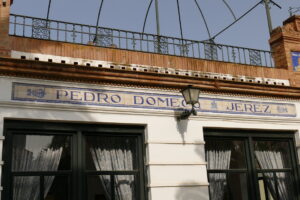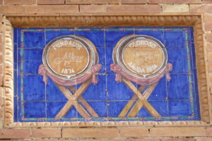 Panel de azulejos en la fachada del pabellón de Bodegas Pedro Domecq