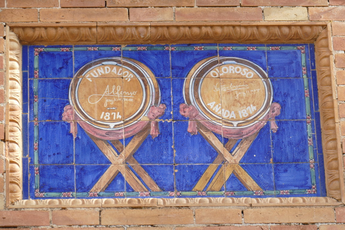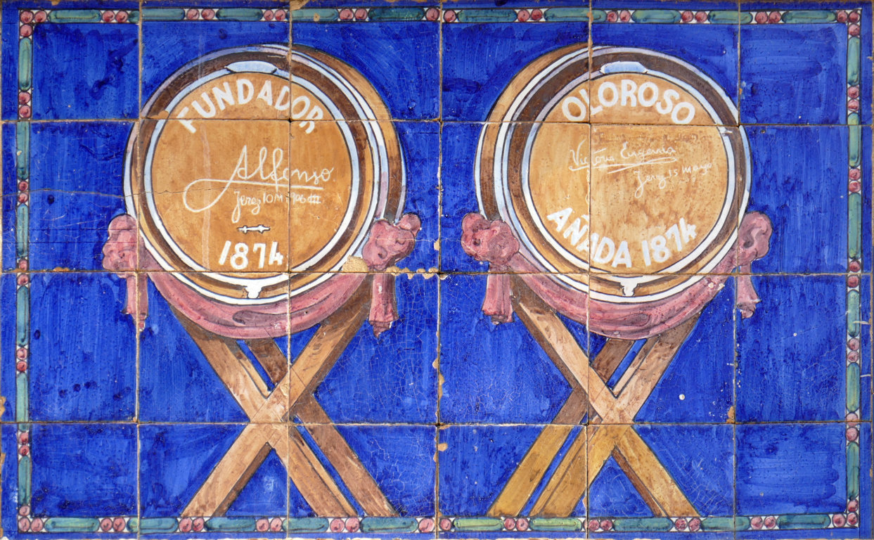 Panel de azulejos con motivos de toneles publicitarios de "Fundador" y "Oloroso"