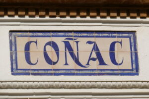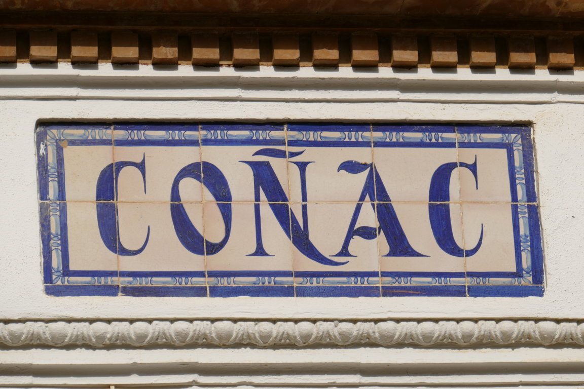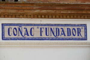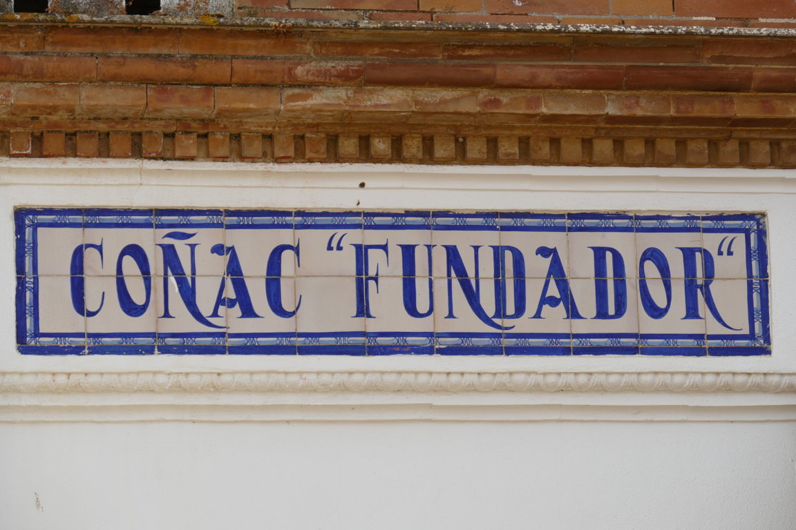 Panel de azulejos de "Coñac Fundador" en la fachada del Pabellón