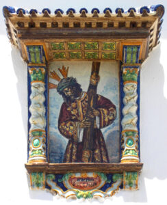 Inicio Obras 08550. Retablo cerámico. Jesús del Gran Poder. Higuera de la Sierra. Huelva. 08550. Retablo cerámico. Jesús del Gran Poder. Higuera de la Sierra. Huelva. Código08550Tipo de obraRetablo cerámicoRetablo monopiezaFunciónDevocionalTipo de panelPictóricoAutorDesconocidoTallerMensaque Rodríguez y Compañía. FábricaFuente de autoríaFirmadoCronologíaDécada de 1940Fuente de la cronologíaEstimaciónDimensiones0,35 m. x 0,60 m. (aprox.)Pieza datadaNo Lugar exacto donde se encuentraFachada de domicilio particular. Avenida de la Cabalgata, 6PoblaciónHiguera de la SierraProvinciaHuelvaPaísEspañaSituada en elExteriorLugar de producciónSevillaZona de producciónAndalucíaTécnica decorativaAzulejo plano pintadoLoza pintadaTema de decoración o temáticaReligiosa - pasionistaEscenaJesús con la cruz al hombroPersonajes representadosJesús de NazaretAdvocacionesGran PoderGran Poder (Sevilla) Autor de las fotografíasManuel Pablo Rodríguez Rodríguez. Junio 2011