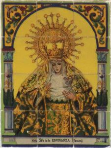 Inicio Obras 08675. Retablo cerámico. Virgen de la Esperanza de Triana. Gines. Sevilla. 08675. Retablo cerámico. Virgen de la Esperanza de Triana. Gines. Sevilla. Código08675Tipo de obraRetablo cerámicoFunciónDevocionalTipo de panelPictóricoAutorDesconocidoTallerNavia Campos, Pedro. Nuestra Señora de la Piedad. FábricaFuente de autoríaFirmadoCronologíaDécada de 1940Fuente de la cronologíaEstimaciónDimensiones0,45 m. x 0,60 m. (aprox.)Pieza datadaNo Lugar exacto donde se encuentraFachada de domicilio particular. Avenida de Europa, 56PoblaciónGinesProvinciaSevillaPaísEspañaSituada en elExteriorLugar de producciónSevillaZona de producciónAndalucíaTécnica decorativaMixta de cuerda seca y azulejo plano pintadoTema de decoración o temáticaReligiosa - pasionistaPersonajes representadosVirgen MaríaAdvocacionesEsperanzaEsperanza de Triana Autor de las fotografíasManuel Pablo Rodríguez Rodríguez. Julio 2012