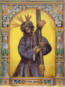 Inicio Obras 08678. Retablo cerámico. Jesús del Gran Poder. Calle Marqués de la Mina. Sevilla. 08678. Retablo cerámico. Jesús del Gran Poder. Calle Marqués de la Mina. Sevilla. Código08678Tipo de obraRetablo cerámicoFunciónDevocionalTipo de panelPictóricoAutorChaves Tejada, AlfonsoTallerRamos Rejano, FábricaFuente de autoríaFirmadoCronologíaDécada de 1950Fuente de la cronologíaEstimaciónDimensiones0,45 m. x 0,60 m. (aprox.)Pieza datadaNo Lugar exacto donde se encuentraInterior de domicilio particular. Calle Marqués de la Mina, 5PoblaciónSevillaProvinciaSevillaPaísEspañaSituada en elInteriorLugar de producciónSevillaZona de producciónAndalucíaTécnica decorativaAzulejo plano pintadoTema de decoración o temáticaReligiosa - pasionistaEscenaJesús con la cruz al hombroPersonajes representadosJesús de NazaretAdvocacionesGran PoderGran Poder (Sevilla) Autor de las fotografíasManuel Pablo Rodríguez Rodríguez. Mayo 2012