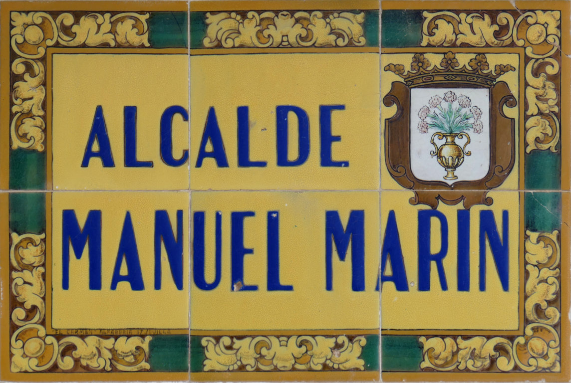 Inicio Obras 08686. Rótulos de la calle Alcalde Manuel Marín. Camas. Sevilla. 08686. Rótulos de la calle Alcalde Manuel Marín. Camas. Sevilla. Código08686Tipo de obraPanel de azulejosRótulo de calleFunciónInformación urbanaTipo de panelPictóricoAutorDesconocidoTallerEl Carmen. FábricaFuente de autoríaFirmadoCronología1943-1952Fuente de la cronologíaPeríodo de actividad del tallerDimensiones0,45 m. x 0,30 m. (aprox.)Pieza datadaSi Lugar exacto donde se encuentraFachadas de domicilios particulares. Calle Alcalde Manuel MarínPoblaciónCamasProvinciaSevillaPaísEspañaSituada en elExteriorLugar de producciónSevillaZona de producciónAndalucíaTécnica decorativaMixta de cuerda seca y azulejo plano pintadoTema de decoración o temáticaEpigráficaHeráldicaEstado de conservaciónPiezas rotas Autor de las fotografíasManuel Pablo Rodríguez Rodríguez. Octubre 2025