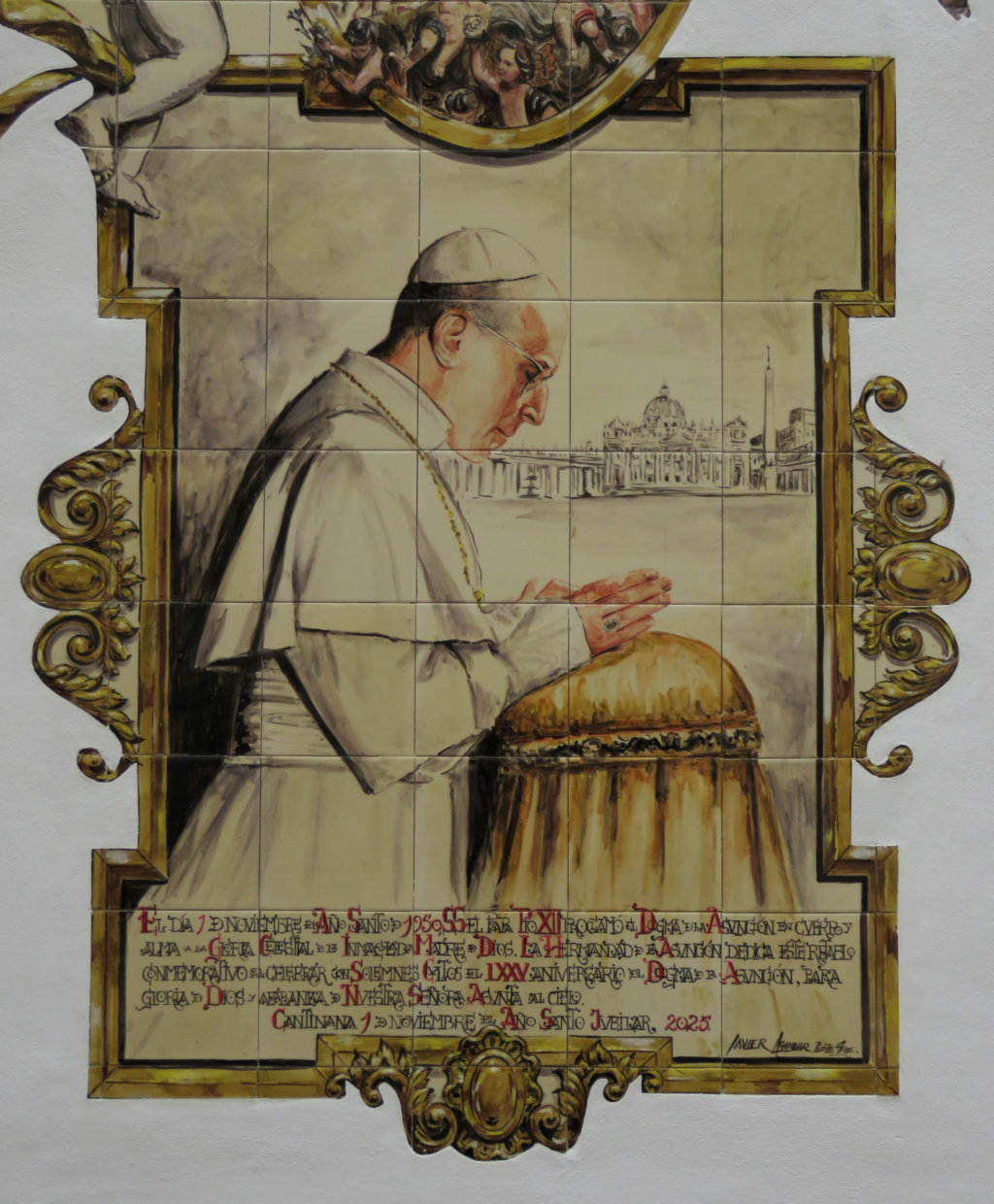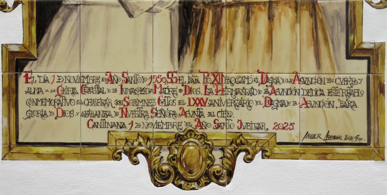 Inicio Obras 08696. Panel conmemorativo. Dogma de la Asunción. Cantillana. Sevilla. 08696. Panel conmemorativo. Dogma de la Asunción. Cantillana. Sevilla. Código08696Tipo de obraPanel de azulejosFunciónConmemorativaDevocionalTipo de panelPictóricoAutorAguilar Cejas, JavierFuente de autoríaFirmadoCronología2025Fuente de la cronologíaDatado en la obraDimensiones0,80 m. x 1,80 m. (aprox.)Pieza datadaSi Lugar exacto donde se encuentraFachada de domicilio particular. Calle IglesiaPoblaciónCantillanaProvinciaSevillaPaísEspañaSituada en elExteriorLugar de producciónPuente GenilZona de producciónAndalucíaTécnica decorativaAzulejo plano pintadoTema de decoración o temáticaEpigráficaReligiosa - letíficaRetratoEscenaAsunción de la VirgenPersonajes representadosÁngelPío XIIVirgen MaríaAdvocacionesAsunciónAsunción (Cantillana) Autor de las fotografíasAlfonso García García. Noviembre 2025