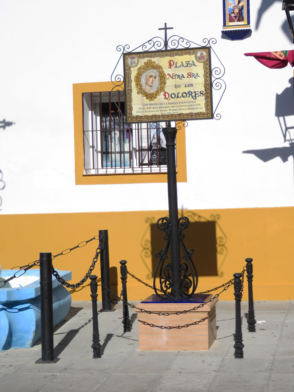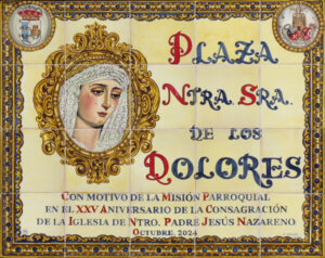 Inicio Obras 08776. Rótulo de la plaza Nuestra Señora de los Dolores. La Algaba. Sevilla. 08776. Rótulo de la plaza Nuestra Señora de los Dolores. La Algaba. Sevilla. Código08776Tipo de obraRótulo de calleFunciónConmemorativaInformación urbanaTipo de panelPictóricoAutorRodríguez Carvajal, José MaríaTallerJoaquín Soriano, Cerámica Artística. TallerFuente de autoríaFirmadoCronología2024Fuente de la cronologíaDatado en la obraDimensiones0,75 m. x 0,60 m. (aprox.)Pieza datadaSi Lugar exacto donde se encuentraPlaza de Nuestra Señora de los Dolores, junto a la Iglesia de Nuestro Padre Jesús NazarenoPoblaciónLa AlgabaProvinciaSevillaPaísEspañaSituada en elExteriorLugar de producciónBenacazónZona de producciónAndalucíaTécnica decorativaAzulejo plano pintadoTema de decoración o temáticaEpigráficaHeráldicaReligiosa - pasionistaPersonajes representadosVirgen MaríaAdvocacionesDolores Autor de las fotografíasAlfonso García García. Noviembre 2025