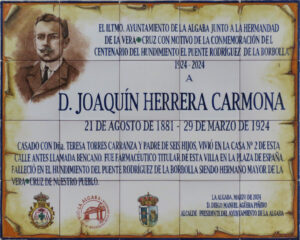 Inicio Obras 08777. Panel conmemorativo. Joaquín Herrera Carmona. La Algaba. Sevilla. 08777. Panel conmemorativo. Joaquín Herrera Carmona. La Algaba. Sevilla. Código08777Tipo de obraPanel de azulejosFunciónConmemorativaTipo de panelPictóricoAutorDesconocidoTallerJoaquín Soriano, Cerámica Artística. TallerFuente de autoríaFirmadoCronología2024Fuente de la cronologíaDatado en la obraDimensiones0,75 m. x 0,60 m. (aprox.)Pieza datadaSi Lugar exacto donde se encuentraFachada de domicilio particular. Calle Joaquín Herrera Carmona, 1PoblaciónLa AlgabaProvinciaSevillaPaísEspañaSituada en elExteriorLugar de producciónBenacazónZona de producciónAndalucíaTécnica decorativaAzulejo plano pintadoTema de decoración o temáticaEpigráficaHeráldicaRetrato Autor de las fotografíasAlfonso García García. Noviembre 2025