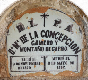Inicio Obras 08784. Lápida funeraria. Cementerio. Ayamonte. Huelva. 08784. Lápida funeraria. Cementerio. Ayamonte. Huelva. Código08784Tipo de obraLápida funerariaFunciónFunerariaTipo de panelPictóricoAutorDesconocidoCronología1882Fuente de la cronologíaDatada en la obraPieza datadaSi Lugar exacto donde se encuentraCementerioPoblaciónAyamonteProvinciaHuelvaPaísEspañaSituada en elInteriorLugar de producciónSevillaZona de producciónAndalucíaTécnica decorativaAzulejo plano pintadoTema de decoración o temáticaEpigráficaEstado de conservaciónDeficiente. Riesgo alto de destrucción ConjuntoAyamonte. Cementerio Municipal Autor de las fotografíasHugo Gómez Jesús. Noviembre 2025