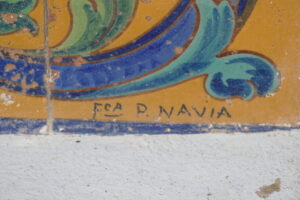 El cronista oficial de Almendralejo, Francisco Zarandieta Arenas, en su web https://almendralejo.cronista.zarandieta.com/ señala lo siguiente: Algo se había mejorado con algunas reformas acometidas en el periodo 1941-1942, bajo el epígrafe presupuestario de “Reforma, ampliación y ornamentación del Paseo de Nuestra Señora de la Piedad”, consistente en construir unos evacuatorios, dos casas para los guardas, y trabajos de ornamentación que fueron diseñados por Pedro Navia Campos, a base de pilastras y arriates; en los que debió incluirse la decoración de la “Glorieta del León”, coronada por la escultura, salida de sus manos o de su taller, fabricado en cerámica policromada y vidriada. El Ayuntamiento, en el Pleno de 15 de mayo de 1942, acordó que se pagara al escultor-ceramista almendralejense, Pedro Navia, las cantidades de 1.805 pesetas por los azulejos y un retablo del patio nuevo del Ayuntamiento; y 1.840 pesetas por dos tinajas, un león y otros efectos.