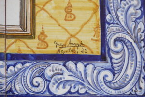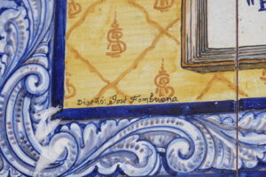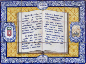 Inicio Obras 08845. Panel conmemorativo. Placentines. Sevilla. 08845. Panel conmemorativo. Placentines. Sevilla. Código08845Tipo de obraPanel de azulejosFunciónConmemorativaTipo de panelPictóricoAutorAragón Cuesta, JuanTallerÁguilas 25Fuente de autoríaFirmadoCronología2000Fuente de la cronologíaDatado en la obraDimensiones0,80 m. x 0.60 m. (aprox.)Pieza datadaSi Lugar exacto donde se encuentraFachada de farmacia. Calle Placentines, esquina con calle Argote de MolinaPoblaciónSevillaProvinciaSevillaPaísEspañaSituada en elExteriorLugar de producciónSevillaZona de producciónAndalucíaTécnica decorativaAzulejo plano pintadoTema de decoración o temáticaEpigráficaHeráldica Más datosEn la esquina inferior izquierda aparece el nombre del diseñador de la obra, José Fombuena. Autor de las fotografíasManuel Pablo Rodríguez Rodríguez. Diciembre 2025