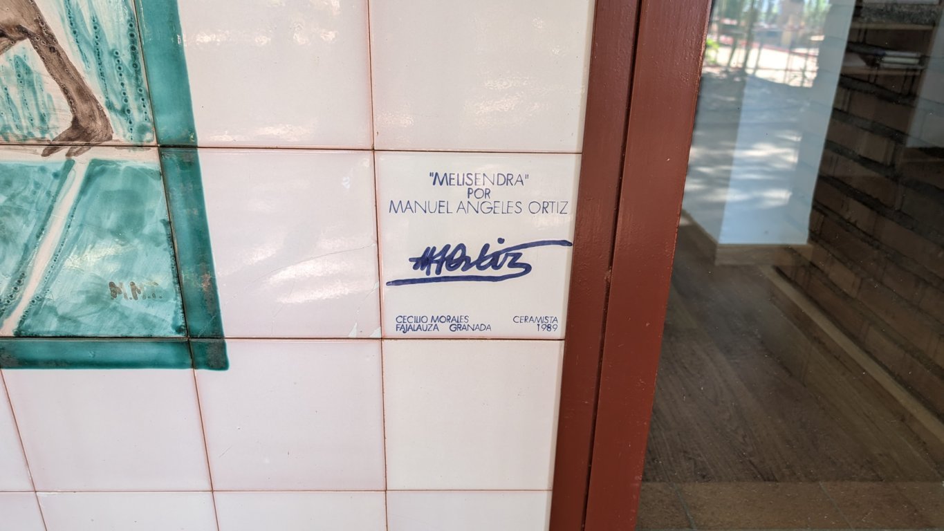 Inicio Obras 08866. Melisendra. Auditorio Manuel de Falla. Granada. 08866. Melisendra. Auditorio Manuel de Falla. Granada. Código08866Tipo de obraPanel de azulejosFunciónOrnamentalTipo de panelPictóricoAutorDesconocidoTallerCecilio Morales. FajalauzaFuente de autoríaFirmadoCronología1989Fuente de la cronologíaDatado en la obraDimensiones1,10 m. x 1,30 m. (aprox.)Pieza datadaSi Lugar exacto donde se encuentraJardines de acceso al Auditorio Manuel de Falla. Paseo de los MártiresPoblaciónGranadaProvinciaGranadaPaísEspañaSituada en elExteriorLugar de producciónGranadaGranada - FajalauzaZona de producciónAndalucíaTécnica decorativaAzulejo plano pintado Más datosEl panel reproduce una obra de Manuel Ángeles Ortiz y contiene la firma M.M.T. Autor de las fotografíasAntonio Entrena Aznarte. Septiembre 2025