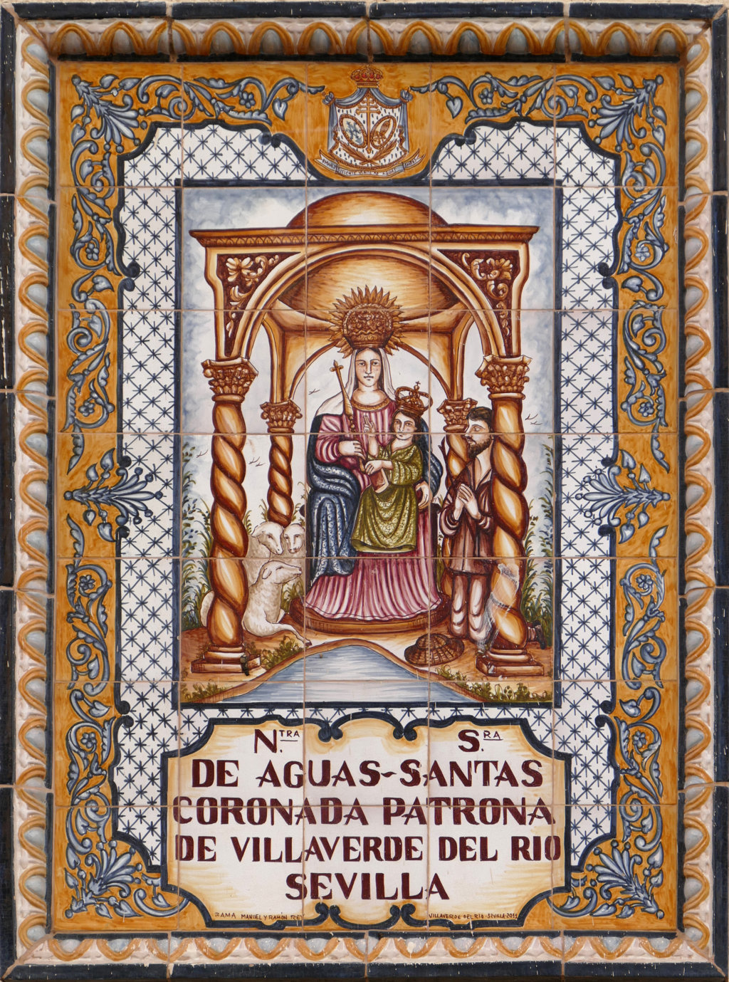 Inicio Obras 08887. Retablo cerámico. Virgen de Aguas Santas. Sevilla. 08887. Retablo cerámico. Virgen de Aguas Santas. Sevilla. Código08887Tipo de obraRetablo cerámicoFunciónDevocionalTipo de panelPictóricoAutorRey Palacios, ManuelTallerRama, Cerámica ArtísticaFuente de autoríaFirmadoCronología2011Fuente de la cronologíaEstimaciónDimensiones0,75 m. x 1,05 m. (aprox.)Pieza datadaSi Lugar exacto donde se encuentraFachada de edificio. Calle Virgen de Aguas Santas esquina con avenida de la República ArgentinaPoblaciónSevillaProvinciaSevillaPaísEspañaSituada en elExteriorLugar de producciónVillaverde del RíoZona de producciónAndalucíaTécnica decorativaAzulejo plano pintadoTema de decoración o temáticaReligiosa - letíficaEscenaVirgen con el NiñoPersonajes representadosJesús de Nazaret NiñoVirgen MaríaAdvocacionesAguas Santas Autor de las fotografíasManuel Pablo Rodríguez Rodríguez. Diciembre 2025