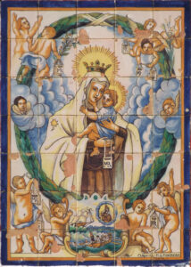 Inicio Obras 08890. Retablo cerámico. Virgen del Carmen. Tomares. Sevilla. 08890. Retablo cerámico. Virgen del Carmen. Tomares. Sevilla. Código08890Tipo de obraRetablo cerámicoFunciónDevocionalTipo de panelPictóricoAutorMoreno Moreno, GuillermoTallerMontalván. FábricaFuente de autoríaFirmadoCronología1940. ca.Fuente de la cronologíaEstimaciónDimensiones0,75 m. x 1,05 m. (aprox.)Pieza datadaNo Lugar exacto donde se encuentraFachada de la Hacienda del Carmen. Calle AceitePoblaciónTomaresProvinciaSevillaPaísEspañaSituada en elInteriorLugar de producciónSevillaZona de producciónAndalucíaTécnica decorativaAzulejo plano pintadoTema de decoración o temáticaReligiosa - letíficaEscenaVirgen con el NiñoPersonajes representadosÁngelJesús de Nazaret NiñoVirgen MaríaAdvocacionesCarmenEstado de conservaciónNumerosas pérdidas de vidriado BibliografíaMoreno Fernández, Ana María. (2020). Guillermo Moreno y la cerámica de Triana. Sevilla. Autor de las fotografíasManuel Pablo Rodríguez Rodríguez. Mayo 2012