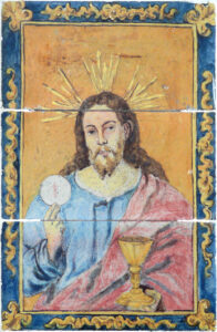 Inicio Obras 08898. Retablo cerámico. Alegoría Sacramental. Hotel La Española. Chipiona. Cádiz. 08898. Retablo cerámico. Alegoría Sacramental. Hotel La Española. Chipiona. Cádiz. Código08898Tipo de obraRetablo cerámicoFunciónDevocionalTipo de panelPictóricoAutorDesconocidoCronologíaDécada de 1920Fuente de la cronologíaEstimaciónDimensiones0,28 m. x 0,42 m. (aprox.)Pieza datadaNo Lugar exacto donde se encuentraPasillo interior del Hotel La Española. Calle Isaac Peral, 6PoblaciónChipionaProvinciaCádizPaísEspañaSituada en elInteriorLugar de producciónSevillaZona de producciónAndalucíaTécnica decorativaAzulejo plano pintadoTema de decoración o temáticaReligiosa - sacramentalReproducción de cuadroPersonajes representadosJesús de NazaretJesús Sacramentado ConjuntoChipiona. Hotel La EspañolaFuente gráficaPintura de Juan de Juanes conservada en el Museo del Prado El Salvador con la Eucaristía obra de Juan de Juanes entre 1545 y 1550. Museo del Prado. Autor de las fotografíasAndrés González Ladera. Octubre 2012