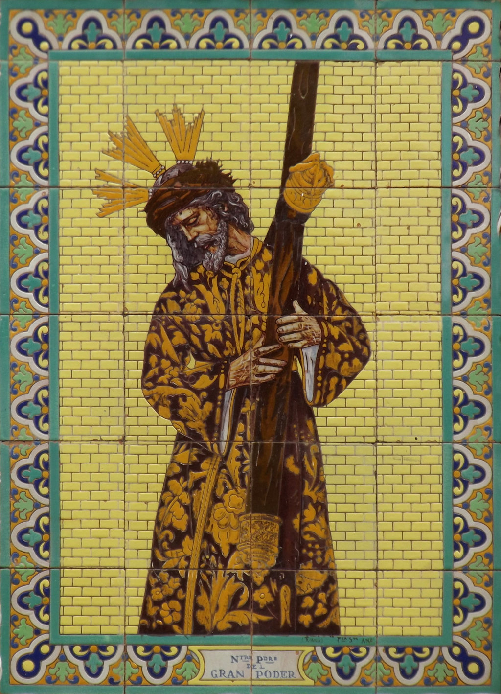 Inicio Obras 08919. Retablo cerámico. Jesús del Gran Poder. Gines. Sevilla. 08919. Retablo cerámico. Jesús del Gran Poder. Gines. Sevilla. Código08919Tipo de obraRetablo cerámicoFunciónDevocionalTipo de panelPictóricoAutorDesconocidoTallerNuestra Señora Santa Ana. FábricaFuente de autoríaFirmadoCronologíaDécada de 1930Fuente de la cronologíaEstimaciónDimensiones0,60 m. x 0,80 m. (aprox.)Pieza datadaNo Lugar exacto donde se encuentraFachada de domicilio particular. Calle Alcalde José Antonio Cabrera Pérez, 17PoblaciónGinesProvinciaSevillaPaísEspañaSituada en elExteriorLugar de producciónSevillaZona de producciónAndalucíaTécnica decorativaMixta de cuerda seca y azulejo plano pintadoTema de decoración o temáticaReligiosa - pasionistaEscenaJesús con la cruz al hombroPeriodoMudéjarPersonajes representadosJesús de NazaretAdvocacionesGran PoderGran Poder (Sevilla) Autor de las fotografíasManuel Pablo Rodríguez Rodríguez. Mayo 2013