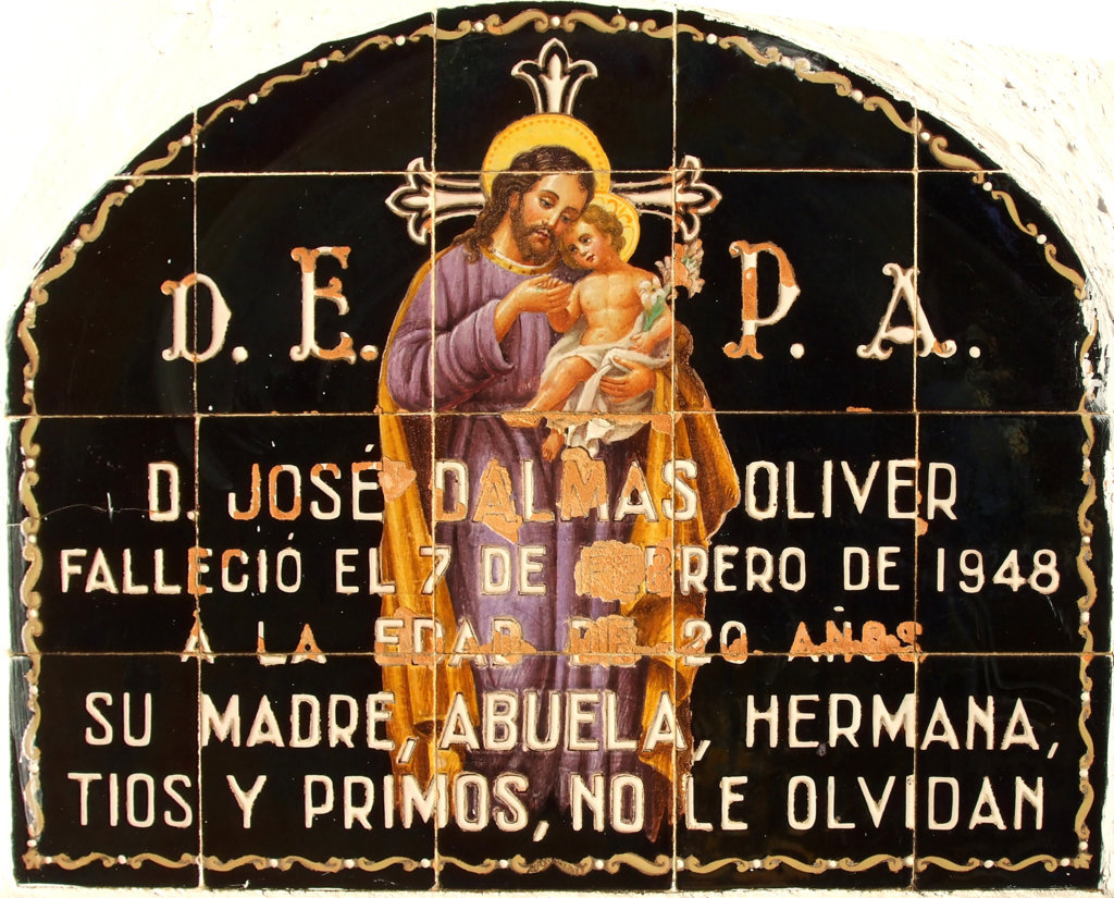 Inicio Obras 08924. Lápida funeraria. Cementerio. Castilleja de la Cuesta. Sevilla. (Desaparecida) 08924. Lápida funeraria. Cementerio. Castilleja de la Cuesta. Sevilla. (Desaparecida) Código08924Tipo de obraLápida funerariaFunciónDevocionalFunerariaTipo de panelPictóricoAutorChaves Tejada, AlfonsoTallerRamos Rejano, FábricaFuente de autoríaAutor: firmado. Taller: por operación comparativaCronología1948Fuente de la cronologíaDatado en la obraDimensiones0,75 m. x 0,50 m. (aprox.)Pieza datadaSi Lugar exacto donde se encuentraCementerio Municipal de San Pablo. (Desaparecida)PoblaciónCastilleja de la CuestaProvinciaSevillaPaísEspañaSituada en elInteriorLugar de producciónSevillaZona de producciónAndalucíaTécnica decorativaMixta de cuerda seca y azulejo plano pintadoTema de decoración o temáticaEpigráficaReligiosa - hagiográficaPersonajes representadosJesús de Nazaret NiñoJosé, SanEstado de conservaciónNumerosas pérdidas de vidriado ConjuntoCastilleja de la Cuesta. CementerioPatrimonio oculto o perdido Autor de las fotografíasManuel Pablo Rodríguez Rodríguez. Noviembre 2011