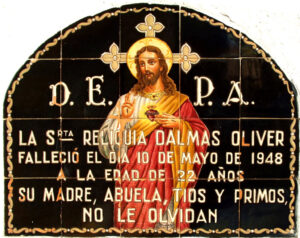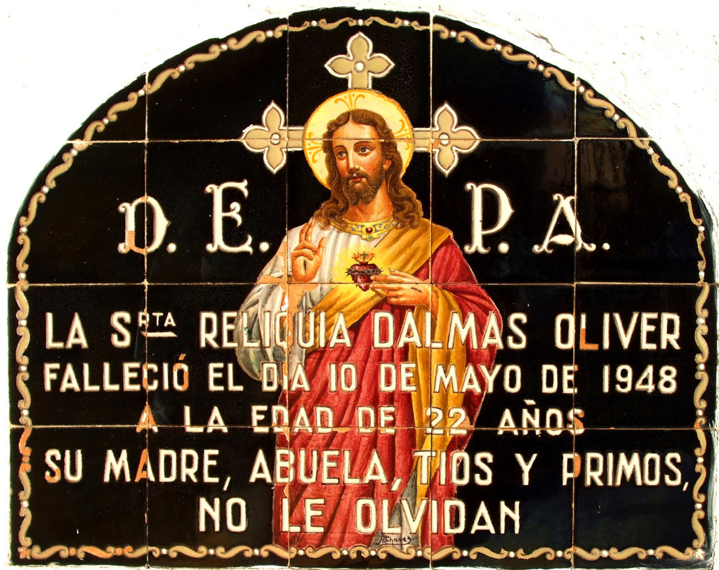 Inicio Obras 08925. Lápida funeraria. Cementerio. Castilleja de la Cuesta. Sevilla. (Desaparecida) 08925. Lápida funeraria. Cementerio. Castilleja de la Cuesta. Sevilla. (Desaparecida) Código08925Tipo de obraLápida funerariaFunciónDevocionalFunerariaTipo de panelPictóricoAutorChaves Tejada, AlfonsoTallerRamos Rejano, FábricaFuente de autoríaAutor: firmado. Taller: por operación comparativaCronología1948Fuente de la cronologíaDatado en la obraDimensiones0,75 m. x 0,50 m. (aprox.)Pieza datadaSi Lugar exacto donde se encuentraCementerio Municipal de San Pablo. (Desaparecida)PoblaciónCastilleja de la CuestaProvinciaSevillaPaísEspañaSituada en elInteriorLugar de producciónSevillaZona de producciónAndalucíaTécnica decorativaMixta de cuerda seca y azulejo plano pintadoTema de decoración o temáticaEpigráficaReligiosa - hagiográficaPersonajes representadosJesús de NazaretAdvocacionesCorazón de JesúsEstado de conservaciónNumerosas pérdidas de vidriado ConjuntoCastilleja de la Cuesta. CementerioPatrimonio oculto o perdido Autor de las fotografíasManuel Pablo Rodríguez Rodríguez. Noviembre 2011