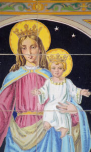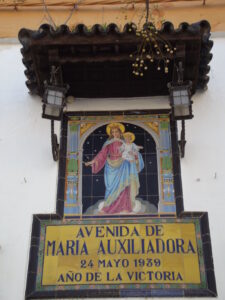 Inicio Obras 08927. Retablo cerámico. María Auxiliadora. Écija. Sevilla. 08927. Retablo cerámico. María Auxiliadora. Écija. Sevilla. Código08927Tipo de obraRetablo cerámicoRótulo de calleFunciónDevocionalInformación urbanaTipo de panelPictóricoAutorAcosta Palop, EduardoTallerMensaque y Vera, José (Hijo de). FábricaFuente de autoríaPor operación comparativaCronología1939Fuente de la cronologíaDatado en panel de azulejos bajo el retabloDimensiones0,80 m. x 1,00 m. (aprox.)Pieza datadaSi Lugar exacto donde se encuentraFachada de domicilio particular. Avenida de María Auxiliadora, 1PoblaciónÉcijaProvinciaSevillaPaísEspañaSituada en elExteriorLugar de producciónSevillaZona de producciónAndalucíaTécnica decorativaMixta de cuerda seca y azulejo plano pintadoTema de decoración o temáticaReligiosa - letíficaEscenaVirgen con el NiñoPersonajes representadosJesús de Nazaret NiñoVirgen MaríaAdvocacionesAuxiliadora Autor de las fotografíasManuel Pablo Rodríguez Rodríguez. Diciembre 2012
