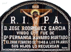 Inicio Obras 08933. Lápida funeraria. Cementerio. Castilleja de la Cuesta. Sevilla. 08933. Lápida funeraria. Cementerio. Castilleja de la Cuesta. Sevilla. Código08933Tipo de obraLápida funerariaFunciónDevocionalFunerariaTipo de panelPictóricoAutorChaves Tejada, AlfonsoTallerRamos Rejano, FábricaFuente de autoríaAutor: firmado. Taller: por operación comparativaCronología1948Fuente de la cronologíaDatado en la obraDimensiones0,75 m. x 0,50 m. (aprox.)Pieza datadaSi Lugar exacto donde se encuentraCementerio Municipal de San PabloPoblaciónCastilleja de la CuestaProvinciaSevillaPaísEspañaSituada en elInteriorLugar de producciónSevillaZona de producciónAndalucíaTécnica decorativaMixta de cuerda seca y azulejo plano pintadoTema de decoración o temáticaEpigráficaReligiosa - pasionistaReproducción de cuadroEscenaCrucificadoPersonajes representadosJesús de NazaretEstado de conservaciónPérdidas de vidriado ConjuntoCastilleja de la Cuesta. CementerioFuente gráficaLienzo de Diego Velázquez conservado en el Museo del Prado Lienzo de Diego Velázquez conservado en el Museo del Prado utilizado como fuente para realizar este retablo. Fotografía: Wikipedia. Autor de las fotografíasManuel Pablo Rodríguez Rodríguez. Noviembre 2011