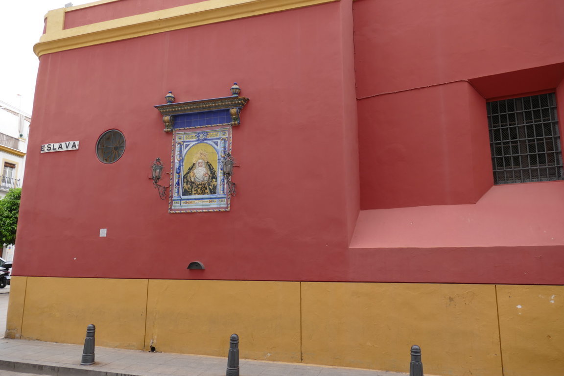 El 27 de febrero de 1944, tras la función principal de instituto, tuvo lugar la bendición del retablo de azulejos de la Virgen de la Soledad, instalado a la espalda de nuestra capilla en la calle Eslava. La ejecución del mismo correspondió al pintor ceramista Alfonso Córdoba Romero, quién lo efectuó en la Fábrica de Pedro Navia de la calle Ruiseñor nº 21, con un costo de 1.165 pesetas. El retablo, que está rematado con una magnífica cornisa de cerámica, se completó con dos faroles de cerrajería artística de bella ejecución del cerrajero José Rodríguez. En el retablo aparece la Stma. Virgen revestida muy al gusto de la época, con el manto de salida del siglo XIX recogido y saya de los mismos años, sobre la que cae un fajín tipo hebrea. La diadema es la neogótica de 1893. Fuente: web oficial de la Hermandad.