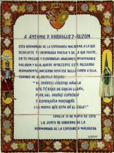Inicio Obras 09003. Panel conmemorativo. Antonio Rodríguez-Buzón. Basílica de la Macarena. Sevilla. 09003. Panel conmemorativo. Antonio Rodríguez-Buzón. Basílica de la Macarena. Sevilla. Código09003Tipo de obraPanel de azulejosFunciónConmemorativaTipo de panelPictóricoAutorMorilla Galea, AntonioFuente de autoríaFirmadoCronología1978Fuente de la cronologíaDatado en la obraDimensiones0,45 m. x 0,60 m. (aprox.)Pieza datadaSi Lugar exacto donde se encuentraPasillo de comunicación de la Basílica de la Macarena con la Parroquia de San GilPoblaciónSevillaProvinciaSevillaPaísEspañaSituada en elInteriorLugar de producciónSevillaZona de producciónAndalucíaTécnica decorativaAzulejo plano pintadoTema de decoración o temáticaEpigráficaHeráldicaEstado de conservaciónRotura ConjuntoSevilla. Basílica de la Macarena Autor de las fotografíasManuel Pablo Rodríguez Rodríguez. Marzo 2014
