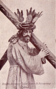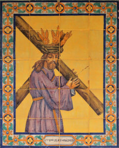 Inicio Obras 09068. Retablo cerámico. Jesús Nazareno. Osuna. Sevilla. 09068. Retablo cerámico. Jesús Nazareno. Osuna. Sevilla. Código09068Tipo de obraRetablo cerámicoFunciónDevocionalTipo de panelPictóricoAutorDesconocidoTallerMontalván. FábricaFuente de autoríaFirmadoCronologíaDécada de 1950Fuente de la cronologíaEstimaciónDimensiones0,60 m. x 0,75 m. (aprox.)Pieza datadaNo Lugar exacto donde se encuentraFachada de domicilio particular. Calle Jesús esquina con calle la CillaPoblaciónOsunaProvinciaSevillaPaísEspañaSituada en elExteriorLugar de producciónSevillaZona de producciónAndalucíaTécnica decorativaAzulejo plano pintadoTema de decoración o temáticaReligiosa - pasionistaEscenaJesús con la cruz al hombroPersonajes representadosJesús de NazaretAdvocacionesNazarenoEstado de conservaciónRotura Fuente gráficaFotografía que se adjunta en la galería Fotografía que sirvió de modelo para pintar el retablo. Autor de las fotografíasCarlos Fernández Aguilar. Mayo 2017