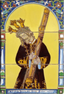 Inicio Obras 09071. Retablo cerámico. Jesús del Gran Poder. Cementerio. Palomares del Río. Sevilla. 09071. Retablo cerámico. Jesús del Gran Poder. Cementerio. Palomares del Río. Sevilla. Código09071Tipo de obraRetablo cerámicoFunciónDevocionalTipo de panelPictóricoAutorDesconocidoTallerMensaque y Vera, José (Viuda de). FábricaFuente de autoríaPor operación comparativaCronología1920. ca.Fuente de la cronologíaEstimaciónDimensiones0,28 m. x 0,42 m. (aprox.)Pieza datadaNo Lugar exacto donde se encuentraInterior del Cementerio Municipal. Calle VelázquezPoblaciónPalomares del RíoProvinciaSevillaPaísEspañaSituada en elInteriorLugar de producciónSevillaZona de producciónAndalucíaTécnica decorativaMixta de cuerda seca y azulejo plano pintadoTema de decoración o temáticaReligiosa - pasionistaEscenaJesús con la cruz al hombroPersonajes representadosJesús de NazaretAdvocacionesGran PoderGran Poder (Sevilla) Autor de las fotografíasManuel Pablo Rodríguez Rodríguez. Octubre 2012