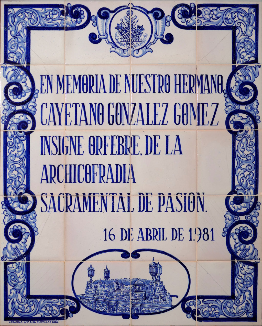 Inicio Obras 09079. Panel conmemorativo. Cayetano González. Sevilla. 09079. Panel conmemorativo. Cayetano González. Sevilla. Código09079Tipo de obraPanel de azulejosFunciónConmemorativaTipo de panelPictóricoAutorSánchez Cueto, JuanTallerCerámica Santa Ana. FábricaFuente de autoríaFirmadoCronología1981Fuente de la cronologíaDatado en la obraDimensiones0,60 m. x 0,75 m. (aprox.)Pieza datadaSi Lugar exacto donde se encuentraDependencias de la Hermandad de Pasión. Iglesia del SalvadorPoblaciónSevillaProvinciaSevillaPaísEspañaSituada en elInteriorLugar de producciónSevillaZona de producciónAndalucíaTécnica decorativaAzulejo plano pintadoTema de decoración o temáticaEpigráfica Autor de las fotografíasAlfonso García García. Febrero 2026