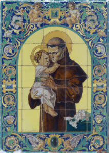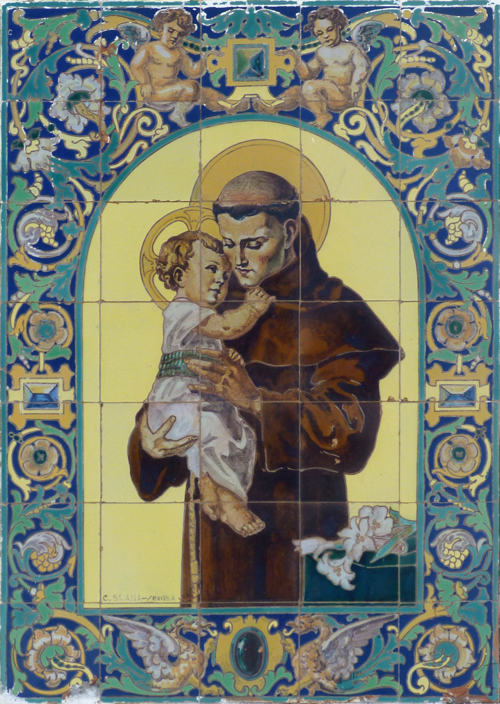 Inicio Obras 09083. Retablo cerámico. San Antonio de Padua. Puente Genil. Córdoba. 09083. Retablo cerámico. San Antonio de Padua. Puente Genil. Córdoba. Código09083Tipo de obraRetablo cerámicoFunciónDevocionalTipo de panelPictóricoAutorDesconocidoTallerCerámica Santa Ana. FábricaFuente de autoríaFirmadoCronologíaDécada de 1940Fuente de la cronologíaEstimaciónDimensiones0,75 m. x 1,05 m. (aprox.)Pieza datadaNo Lugar exacto donde se encuentraFachada del Cortijo San AntonioPoblaciónPuente GenilProvinciaCórdobaPaísEspañaSituada en elExteriorLugar de producciónSevillaZona de producciónAndalucíaTécnica decorativaMixta de cuerda seca y azulejo plano pintadoTema de decoración o temáticaReligiosa - hagiográficaPersonajes representadosAntonio de Padua, SanJesús de Nazaret NiñoEstado de conservaciónPérdidas de vidriado Autor de las fotografíasManuel Quiles Pastor. Septiembre 2012