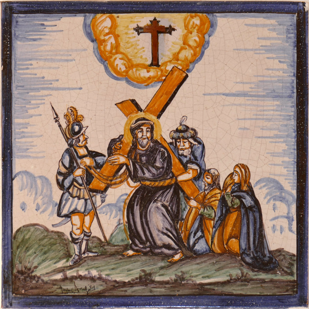 Inicio Obras 09120. Retablo cerámico. Escena de Vía Crucis. Octava estación. Gelves. Sevilla. 09120. Retablo cerámico. Escena de Vía Crucis. Octava estación. Gelves. Sevilla. Código09120Tipo de obraRetablo cerámicoVía CrucisFunciónDevocionalTipo de panelPictóricoAutorAragón Cuesta, JuanTallerÁguilas 25Fuente de autoríaFirmadoCronologíaDécada de 1990Fuente de la cronologíaEstimaciónDimensiones0,25 m. x 0,25 m. (aprox.)Pieza datadaNo Lugar exacto donde se encuentraOratorio en propiedad particularPoblaciónGelvesProvinciaSevillaPaísEspañaSituada en elInteriorLugar de producciónSevillaZona de producciónAndalucíaTécnica decorativaAzulejo plano pintadoTema de decoración o temáticaReligiosa - pasionistaEscenaEncuentro de Jesús con las hijas de JerusalénPersonajes representadosJesús de NazaretSimón de CireneSoldado romano ConjuntoGelves. Oratorio particular. Vía Crucis. Autor de las fotografíasManuel Pablo Rodríguez Rodríguez. Febrero 2026