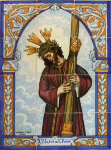 Inicio Obras 09135. Retablo cerámico. Jesús del Gran Poder. Gines. Sevilla. 09135. Retablo cerámico. Jesús del Gran Poder. Gines. Sevilla. Código09135Tipo de obraRetablo cerámicoFunciónDevocionalTipo de panelPictóricoAutorDesconocidoTallerCerámica Santa Ana. FábricaFuente de autoríaFirmadoCronologíaDécada de 1970Fuente de la cronologíaEstimaciónDimensiones0,45 m. x 0,60 m. (aprox.)Pieza datadaNo Lugar exacto donde se encuentraZaguán de domicilio particular. Calle Amigos de Gines, 13PoblaciónGinesProvinciaSevillaPaísEspañaSituada en elInteriorLugar de producciónSevillaZona de producciónAndalucíaTécnica decorativaAzulejo plano pintadoTema de decoración o temáticaReligiosa - pasionistaEscenaJesús con la cruz al hombroPersonajes representadosJesús de NazaretAdvocacionesGran PoderGran Poder (Sevilla) Autor de las fotografíasManuel Pablo Rodríguez Rodríguez