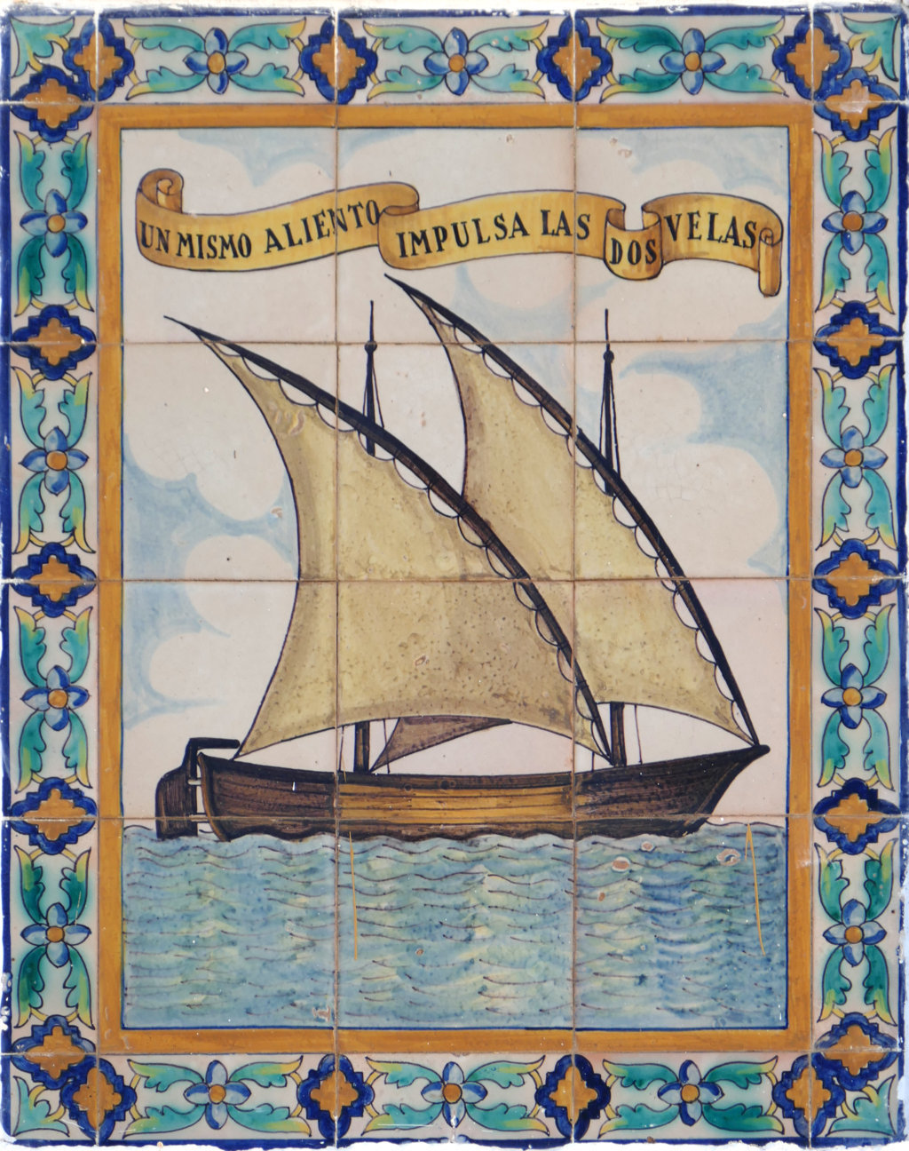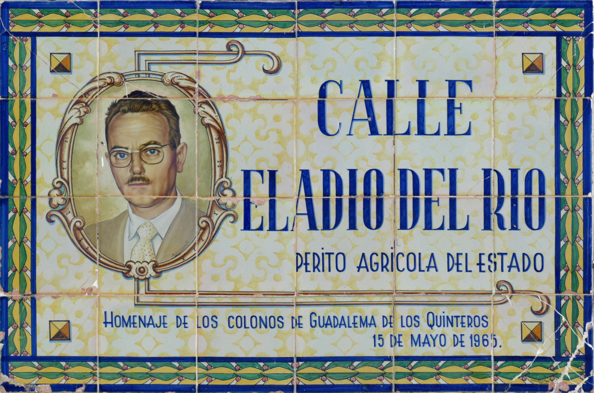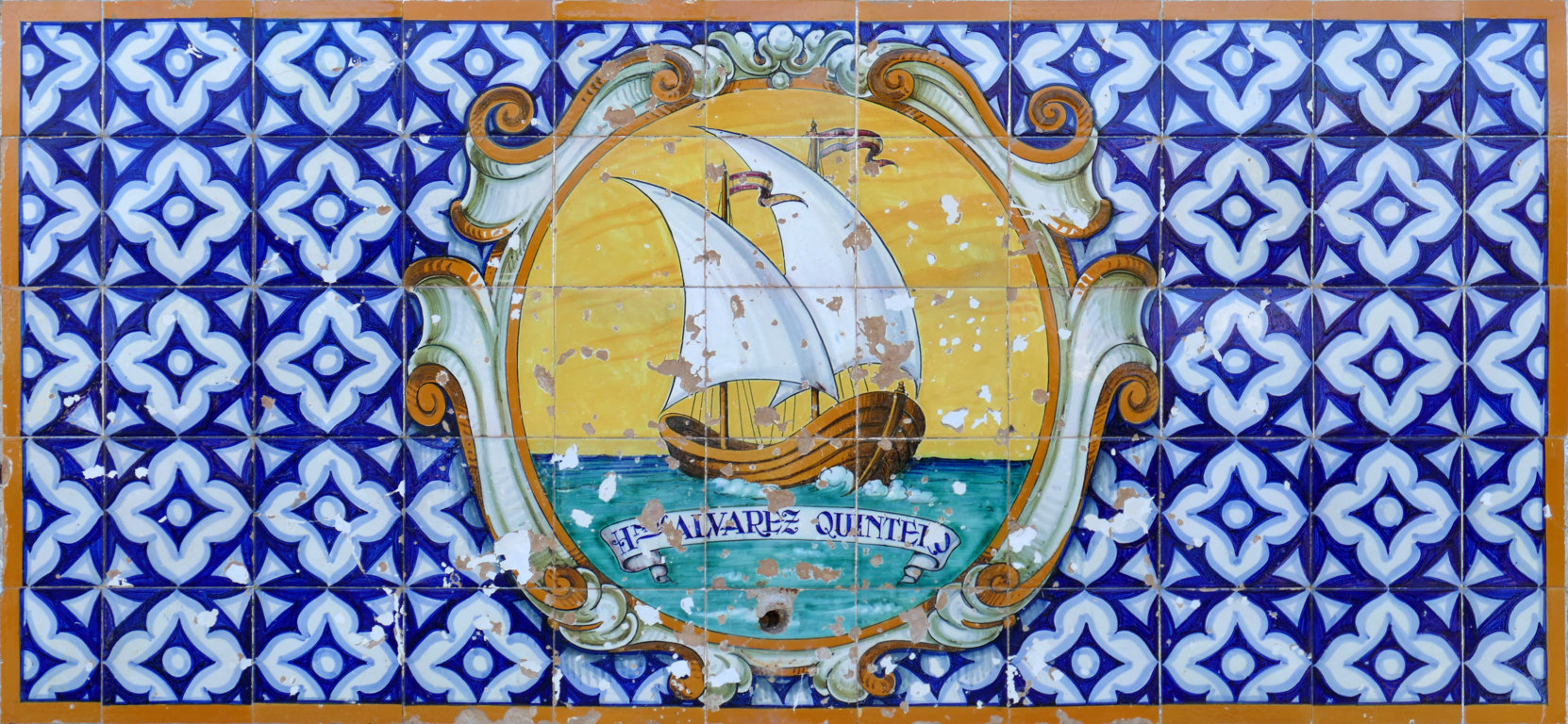 08583. Panel con emblema de los hermanos Álvarez Quintero. Guadalema de los Quintero. Utrera. Sevilla. CronologíaDécada de 1950